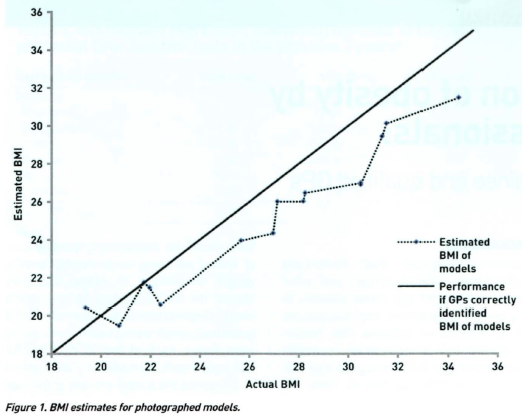 It is not usual to think of estimating BMI by sight as a core clinical skill. It is, after all, accurately assessed by weight and height measurement, which takes less than a minute. However, for GPs to do this they have to start talking to the patient about weight. Assessing that the patient may have a significant weight problem is an important cue for that discussion. It is important that healthcare professionals do not rely visual judgements when identifying patients who may benefit from weight management treatment.