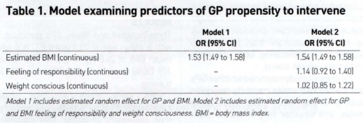 GPs varied greatly on whether they would be likely to intervene on weight. As expected. GPs were more likely to intervene the higher they estimated the photo’s BMI , with an OR of 1.53 [95% Cl = 1.49 to 1 58) per 1.0 kg/m2 increase in estimated BMI. Neither feeling responsible for weight management nor GPs weight consciousness were significant in the model separately or together (Table 1). There was some evidence that qualified GPs were slightly more accurate at categorising the photographed participants than the trainees. but this difference was small. The tendency to underestimate BMI associated with the photographed males actual BMI was similar for trainees and qualified GPs.