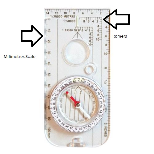 Some people use the millimetres scale which runs alongside the compass base plate (left side of compass) while others prefer to use one of the romers (top right of picture).