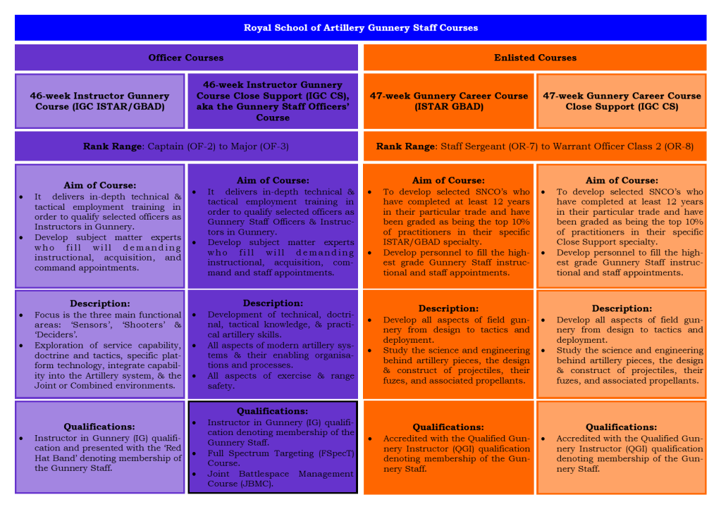 - The premier officer course within the Royal Artillery delivers in-depth technical and tactical employment training in order to qualify selected officers as Instructors in Gunnery.