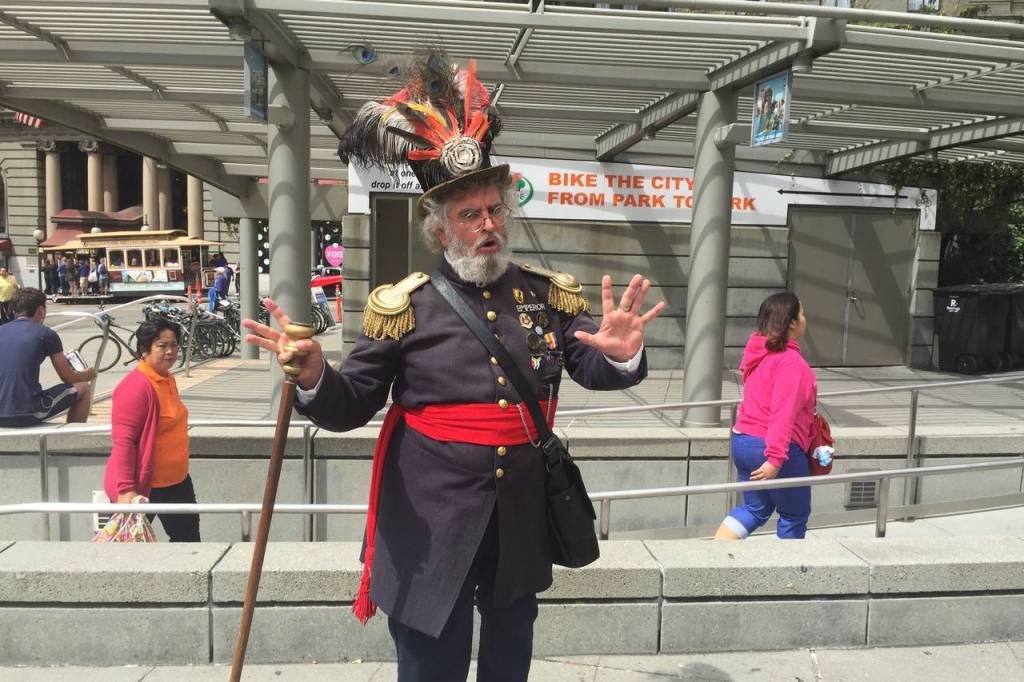 Norton spent his days inspecting San Francisco’s streets in an elaborate blue uniform with gold-plated epaulettes, given to him by officers of the United States Army post at the Presidio of San Francisco. He also wore a beaver hat decorated with a peacock feather and a rosette. He frequently enhanced this imperial posture with a cane or umbrella. During his inspections, he would examine the condition of the sidewalks and cable cars, the state of repair of public property, and the appearance of police officers. He would also frequently give lengthy philosophical expositions on a variety of topics to anyone within earshot.