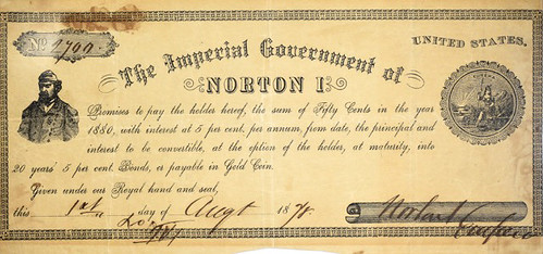 Norton issued his own money in the form of scrip, or promissory notes, which were accepted from him by some restaurants in San Francisco. These notes came in denominations between fifty cents and ten dollars, and the few surviving notes are collector’s items that routinely sell for more than $10,000 at auction.