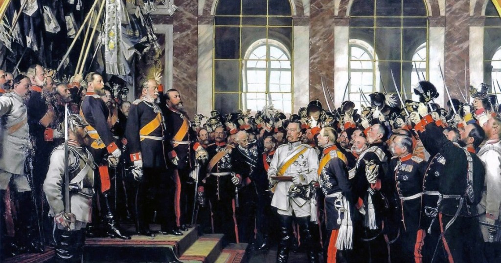 The German states proclaimed their union as the German Empire under the Prussian king Wilhelm I and Chancellor Bismarck. They finally united most of Germany as a nation-state (Austria was excluded). The Treaty of Frankfurt of 10 May 1871 gave Germany most of Alsace and some parts of Lorraine, which became the Imperial territory of Alsace-Lorraine (Reichsland Elsaß-Lothringen).