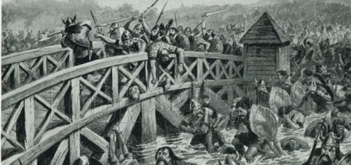 The sudden appearance of the English army caught the Norwegians by surprise. The English advance was then delayed by the need to pass through the choke-point presented by the bridge itself. The Anglo-Saxon Chronicle has it that a giant Norse axeman (possibly armed with a Dane Axe) blocked the narrow crossing and single-handedly held up the entire English army. The story is that this axeman cut down up to 40 Englishmen and was defeated only when an English soldier floated under the bridge in a half-barrel and thrust his spear through the planks in the bridge, mortally wounding the axeman.