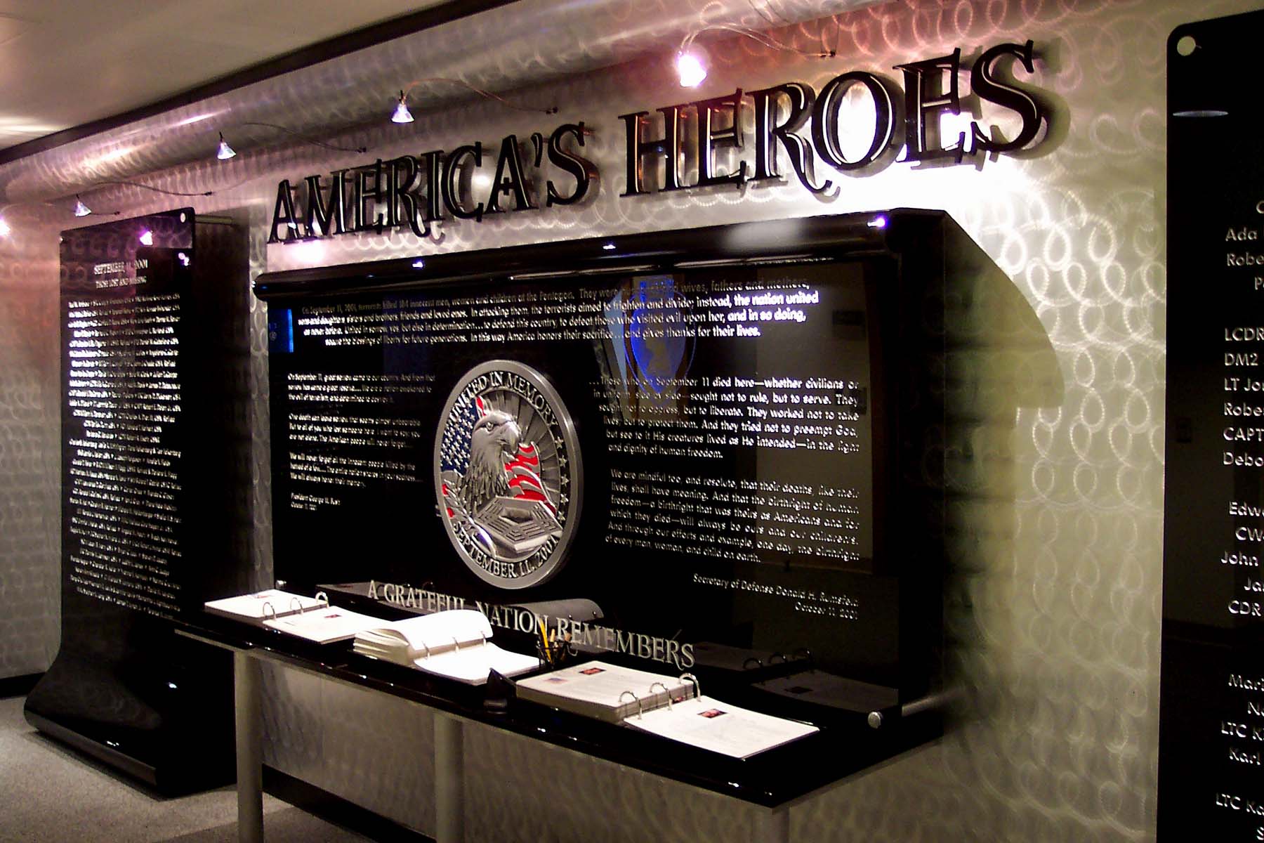 On the building’s main concourse is the Hall of Heroes, opened 1968 and dedicated to the more than 3,460 recipients of the Medal of Honour, the United States’ highest military decoration. The three versions of the Medal of Honour – Army, Sea Service (for the Marine Corps, Navy, and Coast Guard), and Air Force – are on display along with the names of recipients. The Hall is also used for promotions, retirements, and other ceremonies.