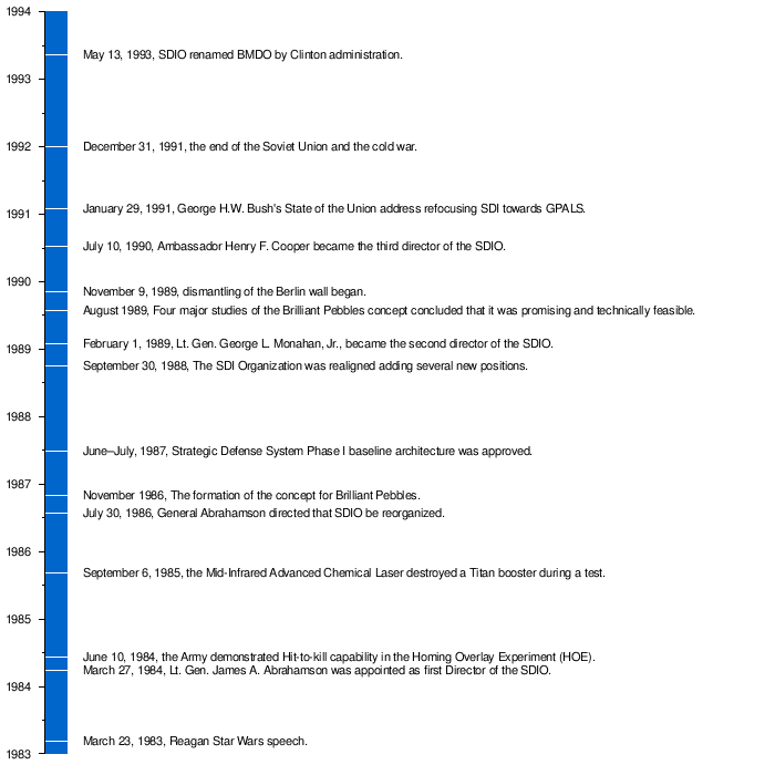 Though regarded as one of the most capable SDI systems, the Brilliant Pebbles program was cancelled in 1994 by the BMDO.