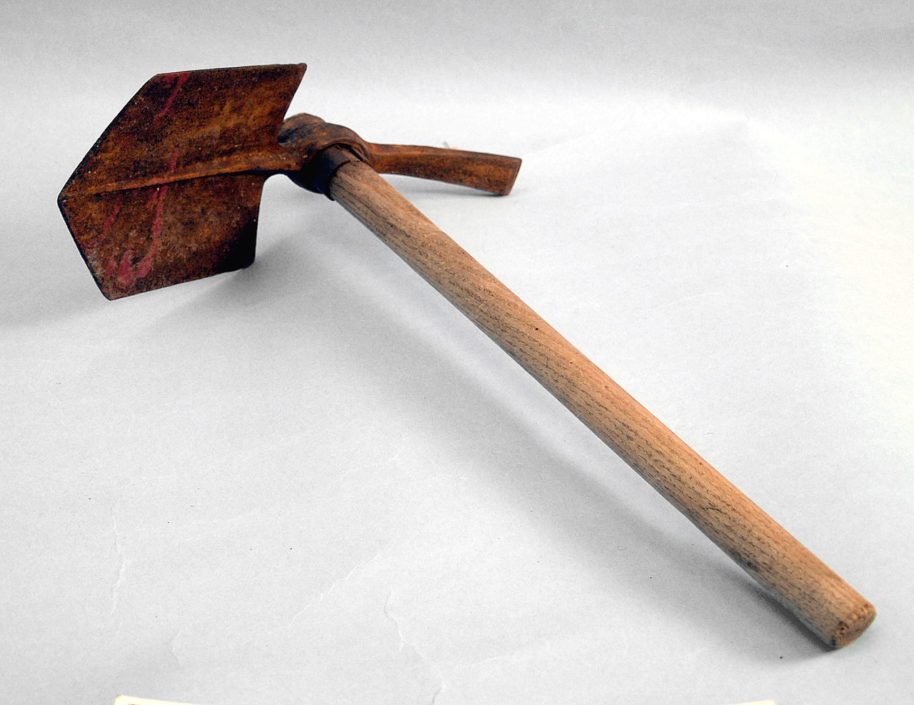 The British entrenching tool of this period was a two part design, with a metal head and a wooden handle, the metal head consisted of an adze/spade blade and a pick spike, used alone the head could be used as a spade with the pick spike serving as a handle. Between the blade and the spike was a ring into which the handle could be inserted at right angles to the head, with the handle inserted the tool could be used as a pick mattock. Besides being used for digging defensive fighting positions, entrenching tools were used for digging latrines and graves.