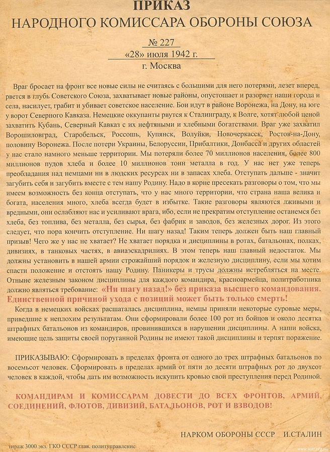 Order No. 227 (Russian: Приказ № 227}, romanised: Prikaz No. 227) was an order issued on 28 July 1942 by Joseph Stalin, who was acting as the People’s Commissar of Defence.