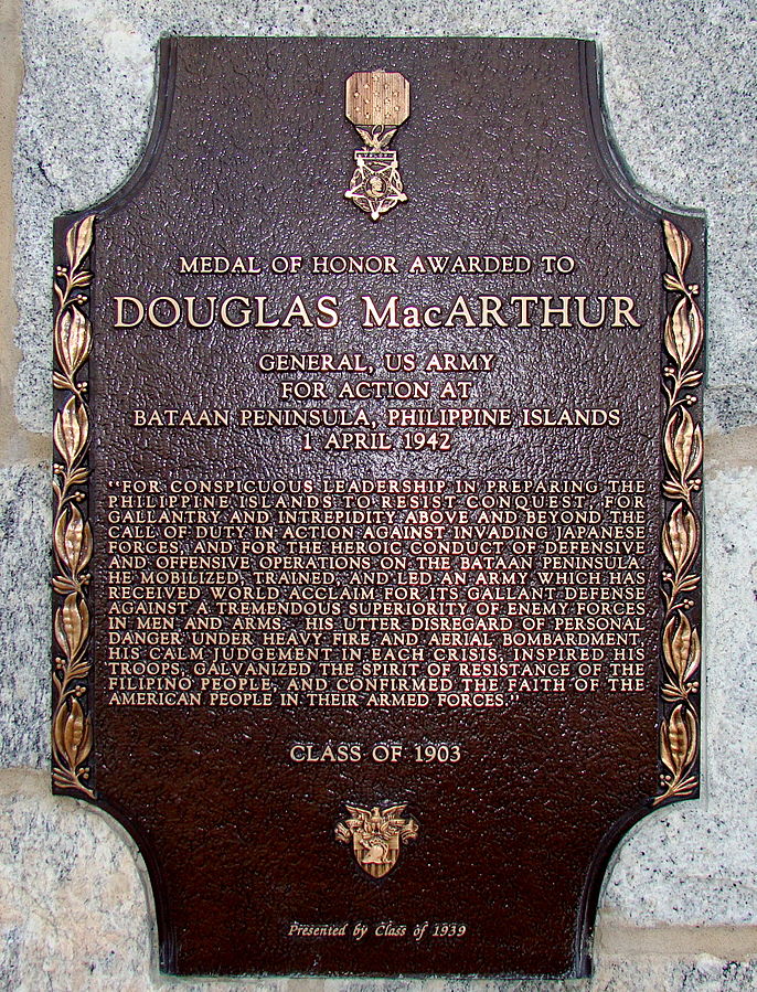 For conspicuous leadership in preparing the Philippine Islands to resist conquest, for gallantry and intrepidity above and beyond the call of duty in action against invading Japanese forces, and for the heroic conduct of defensive and offensive operations on the Bataan Peninsula. He mobilized, trained, and led an army which has received world acclaim for its gallant defense against a tremendous superiority of enemy forces in men and arms. His utter disregard of personal danger under heavy fire and aerial bombardment, his calm judgment in each crisis, inspired his troops, galvanized the spirit of resistance of the Filipino people, and confirmed the faith of the American people in their Armed Forces.