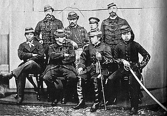 Meanwhile, the leader of the shōgun’s navy, Enomoto Takeaki, refused to surrender all his ships. He remitted just four ships, among them the Fujiyama, but he then escaped north with the remnants of the shōgun’s navy (eight steam warships: Kaiten, Banryū, Chiyodagata, Chōgei, Kaiyō Maru, Kanrin Maru, Mikaho and Shinsoku), and 2,000 personnel, in the hope of staging a counter-attack together with the northern daimyōs. He was accompanied by a handful of French military advisers, notably Jules Brunet, who had formally resigned from the French Army to accompany the rebels.