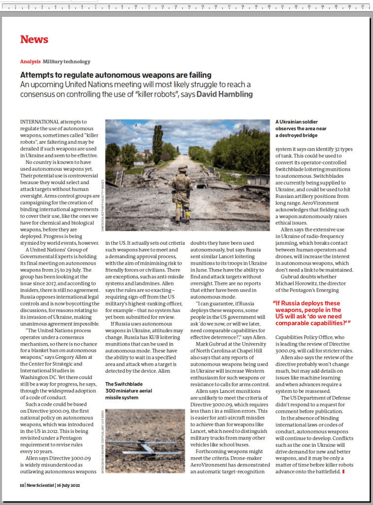 New Scientist. (2022) Attempts to Regulate Autonomous Weapons are Failing. New Scientist. 19 July 2022, pp.12.