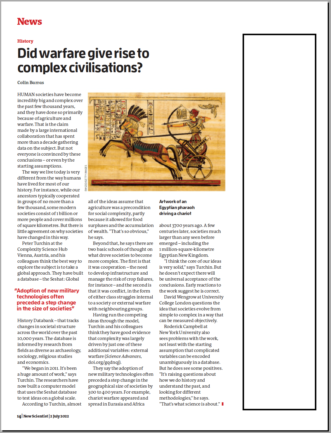 Barras, C. (2022) Did Warfare Give Rise To Complex Civilisations? New Scientist. 02 July 2022, pp.14.