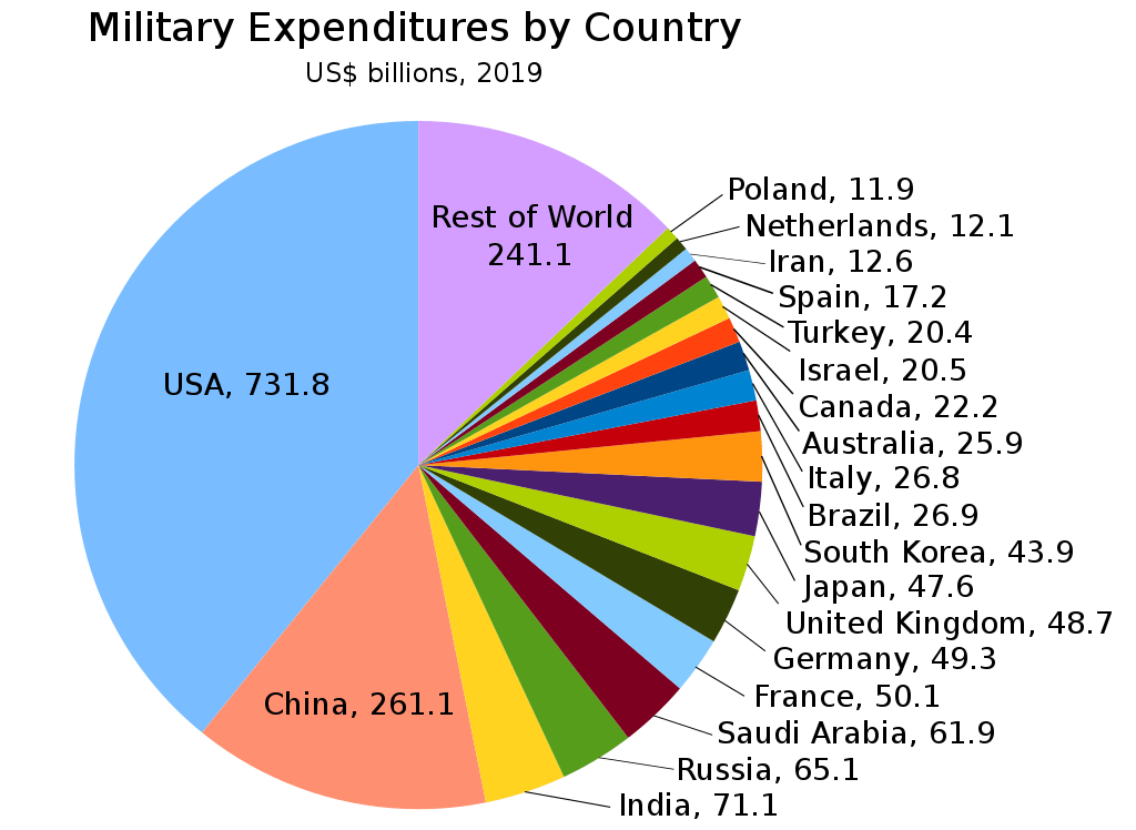 A pie chart showing global military expenditures by country for 2019, in US$ billions, according to SIPRI.