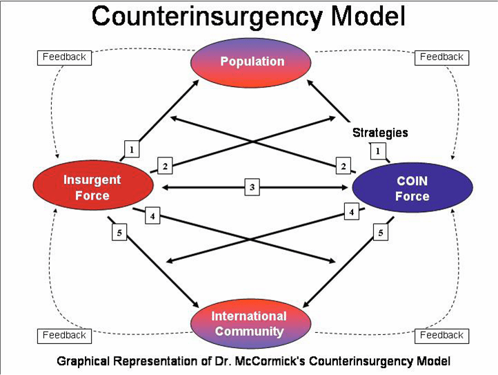 McCormick’s model is designed as a tool for counterinsurgency (COIN), but develops a symmetrical view of the required actions for both the Insurgent and COIN forces to achieve success. In this way the counterinsurgency model can demonstrate how both the insurgent and COIN forces succeed or fail. The model’s strategies and principle apply to both forces, therefore the degree the forces follow the model should have a direct correlation to the success or failure of either the Insurgent or COIN force.