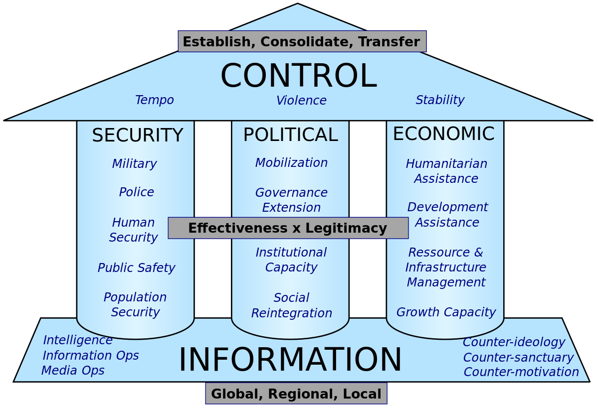 The counterinsurgency strategy can be described as efforts to end the insurgency by a campaign developed in balance along three “pillars”: security, political, and economical.