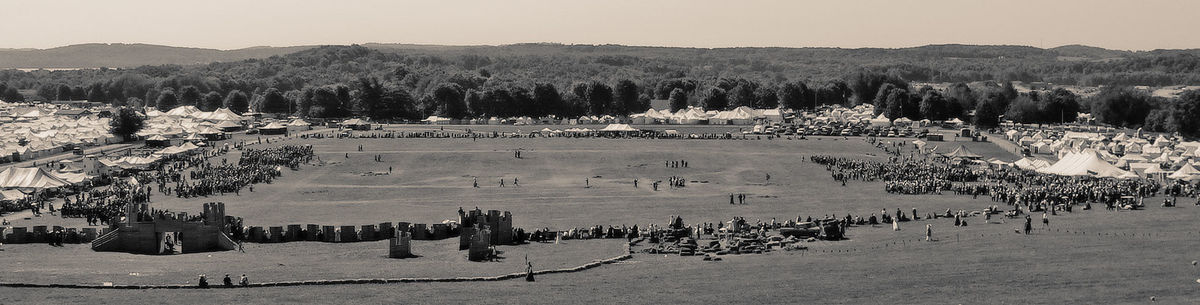 Melee tournaments can include a number of combatants taking to the field. Especially at large events such as Pennsic War, combats may include wars, where large number of participants can take the field at once, and these may include archers, artillery and fortifications. Sometimes, novelty combat may occur, where for instance, the fighters take the form of chess pieces.