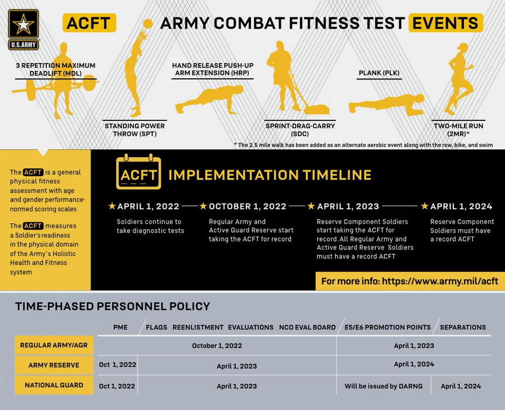 The ACFT will not immediately impact personnel actions. It has phased implementation deadlines ranging from Oct. 1 of this year [2022] to April 1, 2024. (Winkie, 2022).