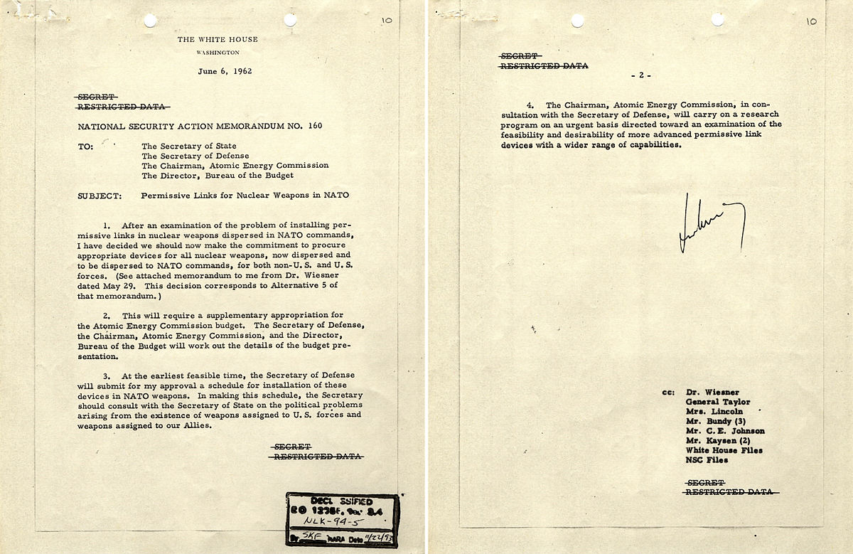 In June 1962, President John F. Kennedy signed the National Security Action Memorandum number 160. This presidential directive ordered the installation of PALs in all US nuclear weapons in Europe. All other US nuclear weapons were excluded at that time. The conversion was completed in September 1962 and cost $23 million ($223 million in 2022 dollars).