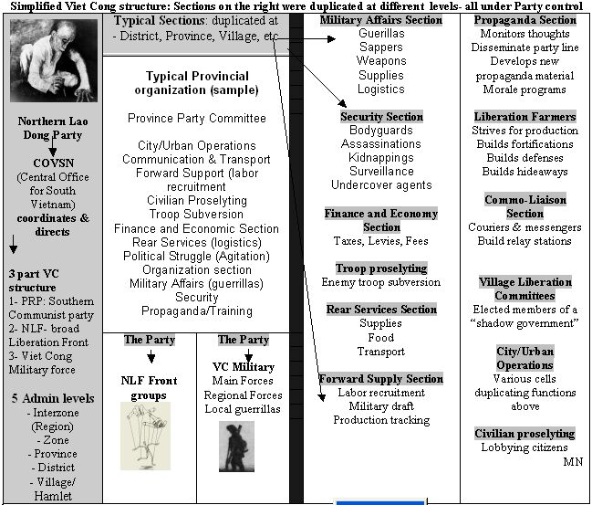 Guerrilla warfare resembles rebellion, yet it is a different concept. Guerrilla organisation ranges from small, local rebel groups of a few dozen guerrillas, to thousands of fighters, deploying from cells to regiments. In most cases, the leaders have clear political aims for the warfare they wage. Typically, the organisation has political and military wings, to allow the political leaders “plausible denial” for military attacks. The most fully elaborated guerrilla warfare structure is by the Chinese and Vietnamese communists during the revolutionary wars of East and Southeast Asia. A simplified example of this more sophisticated organisational type – used by revolutionary forces during the Vietnam War, is shown below/above ———.