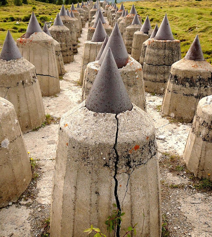 Switzerland continues to maintain lines of dragon’s teeth in certain strategic areas. In military jargon, these constructions can be referred to as “Toblerone lines”, after the chocolate bar.