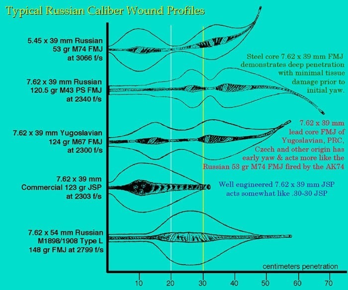 The AK fires the 7.62×39mm cartridge with a muzzle velocity of 715 m/s (2,350 ft/s). The cartridge weight is 16.3 g (0.6 oz), the projectile weight is 7.9 g (122 gr). The original Soviet M43 bullets are 123 grain boat-tail bullets with a copper-plated steel jacket, a large steel core, and some lead between the core and the jacket. The AK has excellent penetration when shooting through heavy foliage, walls or a common vehicle’s metal body and into an opponent attempting to use these things as cover. The 7.62×39mm M43 projectile does not generally fragment when striking an opponent and has an unusual tendency to remain intact even after making contact with bone. The 7.62×39mm round produces significant wounding in cases where the bullet tumbles (yaws) in tissue, but produces relatively minor wounds in cases where the bullet exits before beginning to yaw. In the absence of yaw, the M43 round can pencil through tissue with relatively little injury.