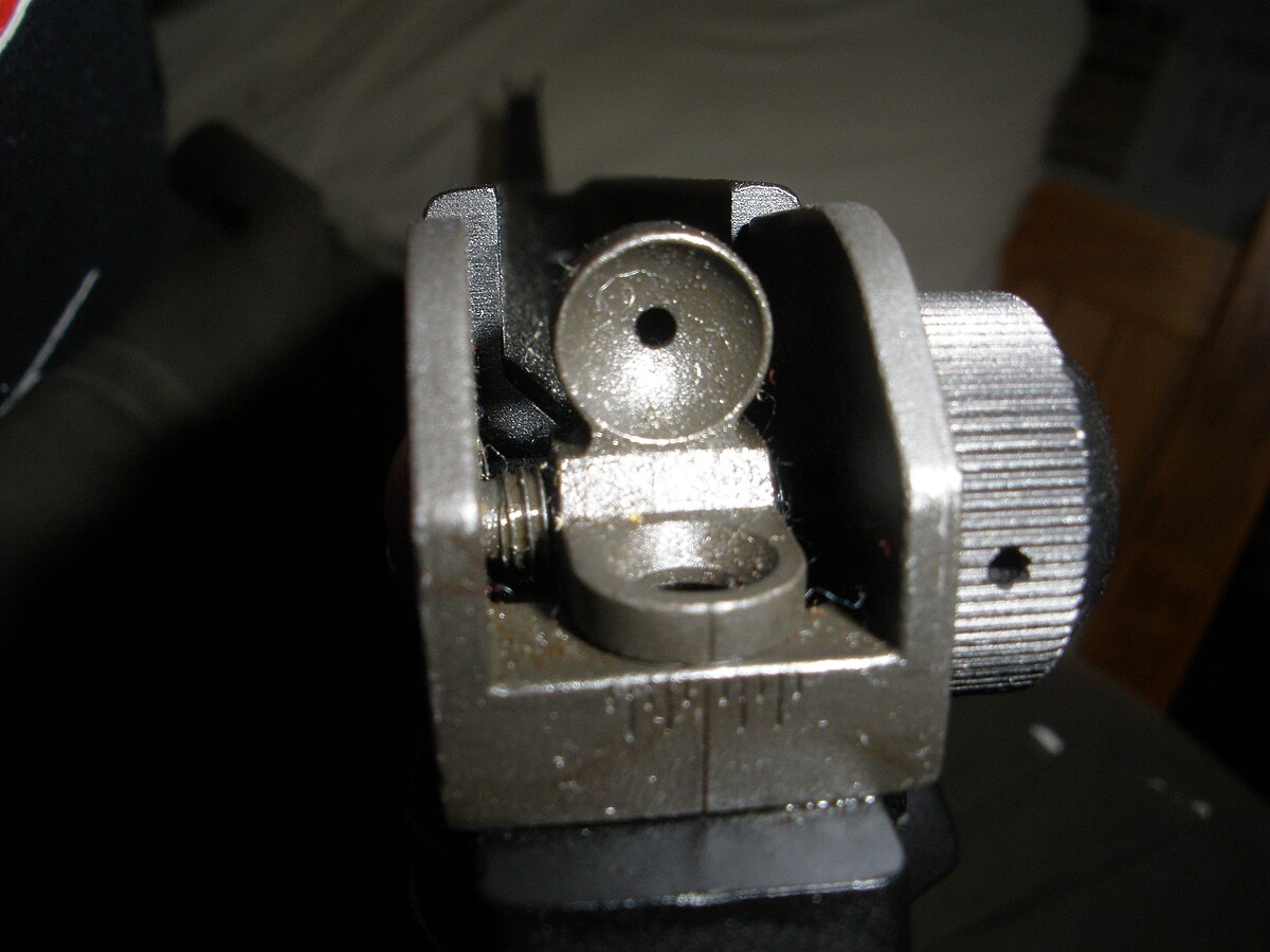 With the advent of the M16A2, a less simple fully adjustable rear sight was added, allowing the rear sight to be dialed in with an elevation wheel for specific range settings between 300 and 800 m (328 and 875 yd) in 100 m increments and to allow windage adjustments with a windage knob without the need of a cartridge or tool. The unmarked approximately 0.070 in (1.78 mm) diameter aperture rear sight is for normal firing situations, zeroing and with the elevation knob for target distances up to 800 meters. The downsides of relatively small rear sight apertures are less light transmission through the aperture and a reduced field of view. A new larger approximately 0.200 in (5.08 mm) diameter aperture, marked ‘0-2’ and featuring a windage setting index mark, offers a larger field of view during battle conditions and is used as a ghost ring for quick target engagement and during limited visibility. When flipped down, the engraved windage mark on top of the ‘0-2’ aperture ring shows the dialled in windage setting on a windage scale at the rear of the rear sight assembly. When the normal use rear aperture sight is zeroed at 300 m with SS109/M855 ammunition, first used in the M16A2, the ‘0-2’ rear sight will be zeroed for 200 m. The front sight post was widened to approximately 0.075 in (1.91 mm) diameter and became square and became adjustable during zeroing in about 1.2 MOA increments.