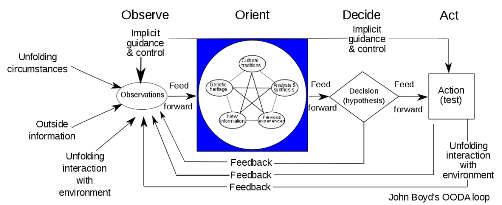 The OODA loop has become an important concept in litigation, business, law enforcement, management education, and military strategy. According to Boyd, decision-making occurs in a recurring cycle of “observe, orient, decide, act”. An entity (whether an individual or an organisation) that can process this cycle quickly, observing and reacting to unfolding events more rapidly than an opponent, can thereby get inside the opponent’s decision cycle and gain the advantage.