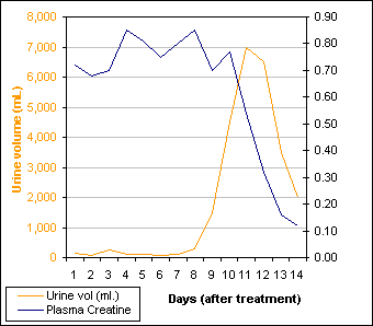 The kidney’s resorptive mechanisms are particularly energetic, using nearly 100% of the O2 supplied. Thus, the kidney is particularly sensitive to reduction in blood supply. This phenomenon occurs because renal flow is restored prior to the normal resorption function of the renal tubule. As shown by the graph, urine flow recovers rapidly and subsequently overshoots the typical daily output (between 800 mL and 2L in most people). Since the kidney’s resorption capacity takes longer to re-establish, there is a minor lag in function that follows recovery of flow. A good reference range for plasma creatinine is between 0.07 – 0.12 mmol/L.