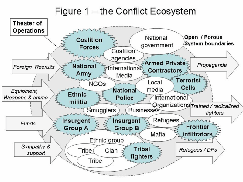Kilcullen describes a framework for counterinsurgency. He gives a visual overview of the actors in his model of conflicts, which he represents as a box containing an “ecosystem” defined by geographic, ethnic, economic, social, cultural, and religious characteristics. Inside the box are, among others, governments, counterinsurgent forces, insurgent leaders, insurgent forces, and the general population, which is made up of three groups: