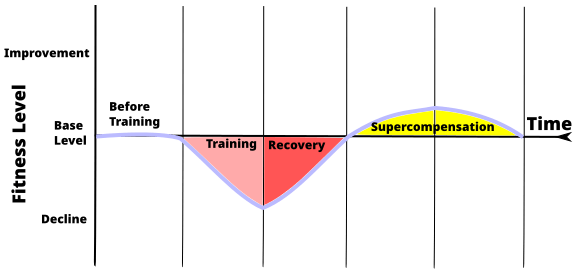 - Recovery: After the training period, the body enters the recovery period, during which the level of fitness increases back to the initial fitness level.