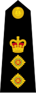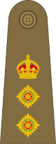 The insignia is two diamond-shaped pips (properly called “Bath Stars”) below a crown. Gorget patches, colloquially known as red tabs, with crimson lace and a brass button are also worn by officers of the substantive rank of colonel as part of their general staff uniform. Gorget patches are not worn by regimental colonels, who wear the regimental uniform.