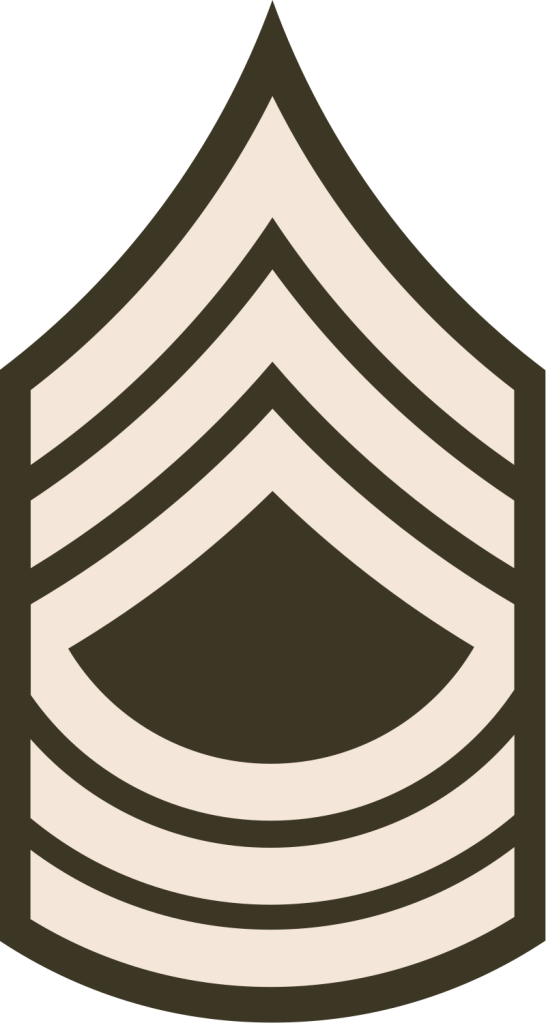 Master sergeant (MSG) is the eighth enlisted grade (E-8), ranking above sergeant first class and below sergeant major, command sergeant major, Sergeant Major of the Army, and equal in grade but not authority to a first sergeant. It is abbreviated as MSG and indicated by three chevrons above three inverted arcs, commonly referred to as “rockers”.