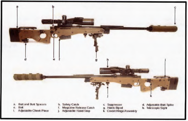 It is a large calibre bolt-action rifle, produced by Accuracy International®, which fires a 0.338 inch (8.59 mm) round fed by a 5-round box magazine. The rifle has seen service on operations since 2008. The rifle measures 1265 mm in length and weighs 7.81 kg. The rifle has an effective range out to 1200 metres.
