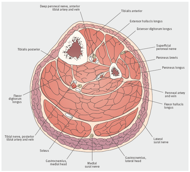 Figure 1: Cross sectional anatomy of the leg midway between the knee and ankle, including muscles and neurovascular structures in each of the four leg compartments.