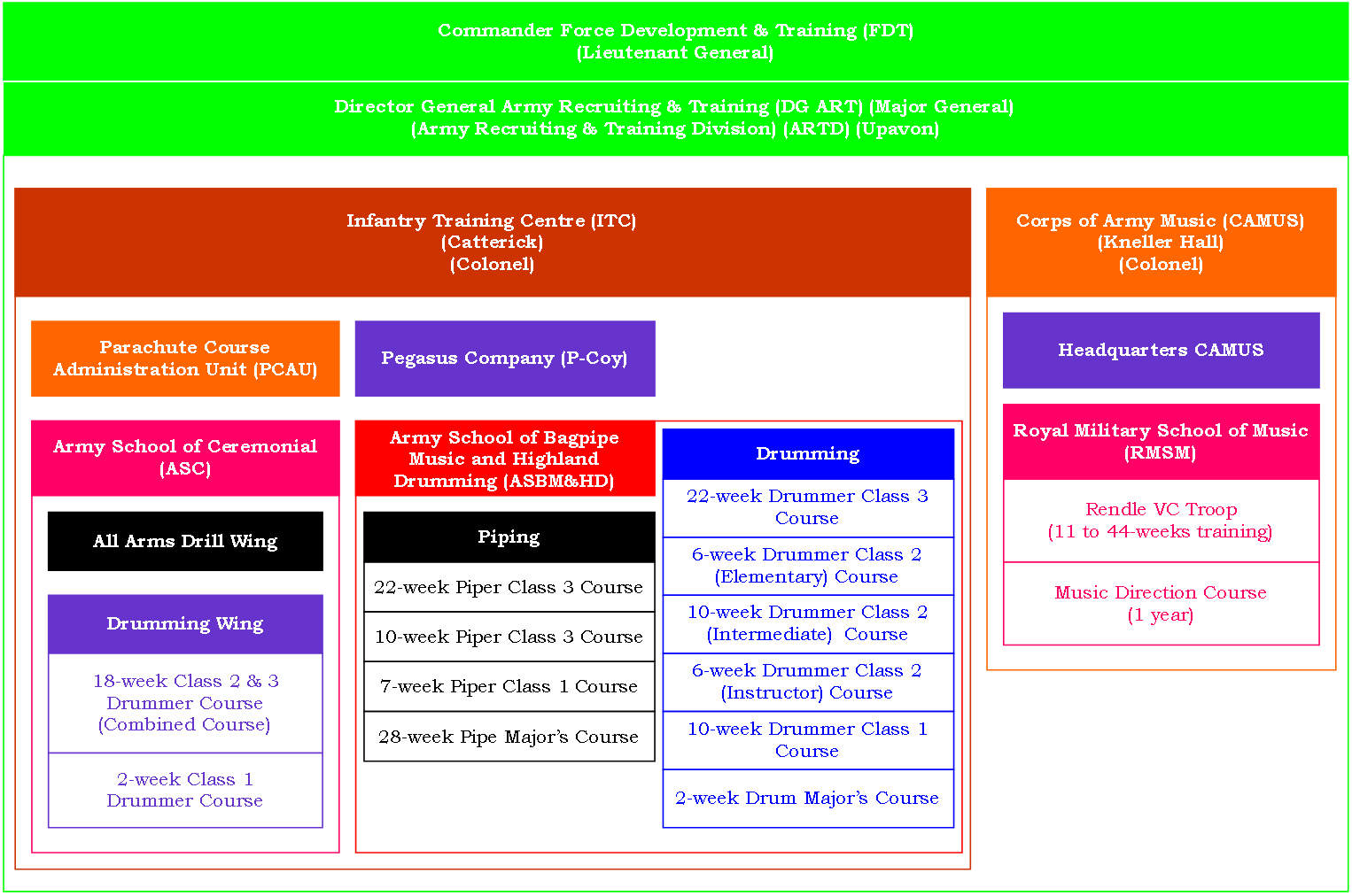 Both the ASBM&HD and DW form part of the Infantry Training Centre. The RMSM forms part of the Corps of Army Music.