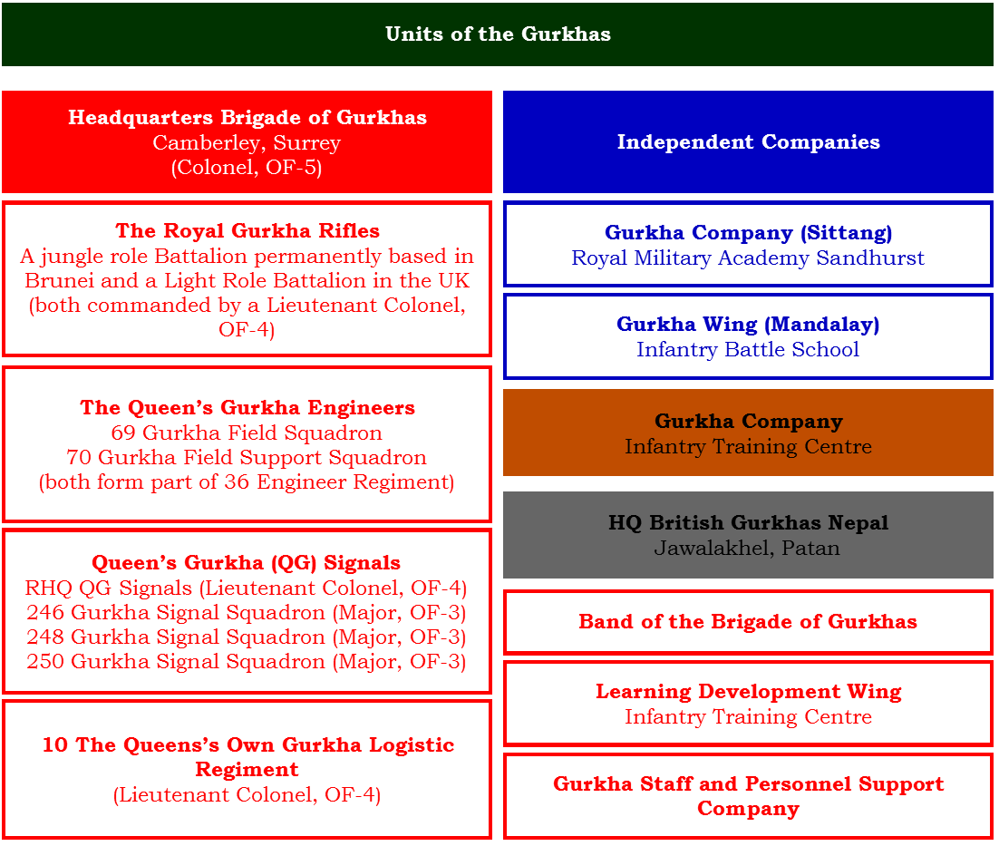 The Gurkhas are a part of the British Army and are composed of a number of different units, with the Brigade of Gurkhas being the largest element, as illustrated in Figure 1 below.