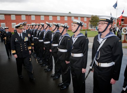 NEOC will graduate as one unit, bearing arms, the Australian White Ensign (AWE) and the RAN Band. This event is customarily reviewed by the highest ranking Officer in the RAN, the Chief of Navy, although the Governor General of Australia has also reviewed these graduations due to the high profile of RAN officer training.
