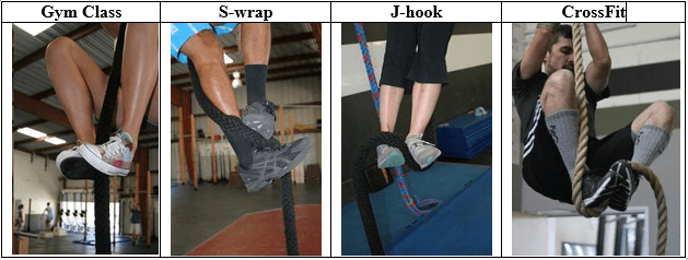 Table 1 outlines methods of rope climbing using both hands and feet.