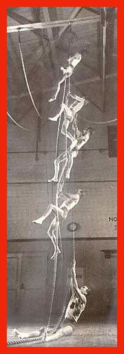 - The climber leaning back and executing an explosive pull and surge upward, kicking the legs as they ascended the rope, using hands only.