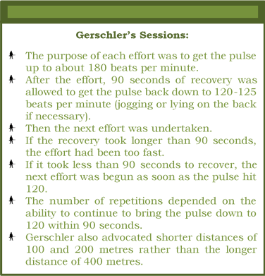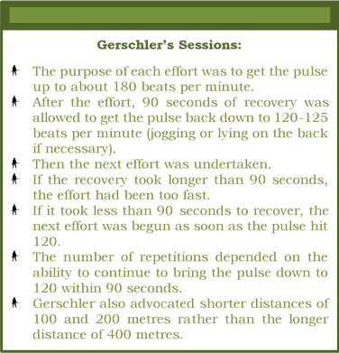Gerschler’s method gave very rapid improvements in performance and as the heart became fitter and returned to 120 bpm more quickly the recovery intervals became naturally reduced. This natural reduction in the recovery interval due to increased fitness was combined with increasing the total number of repetitions to progress the training, rather than increasing the speed of the repetitions.